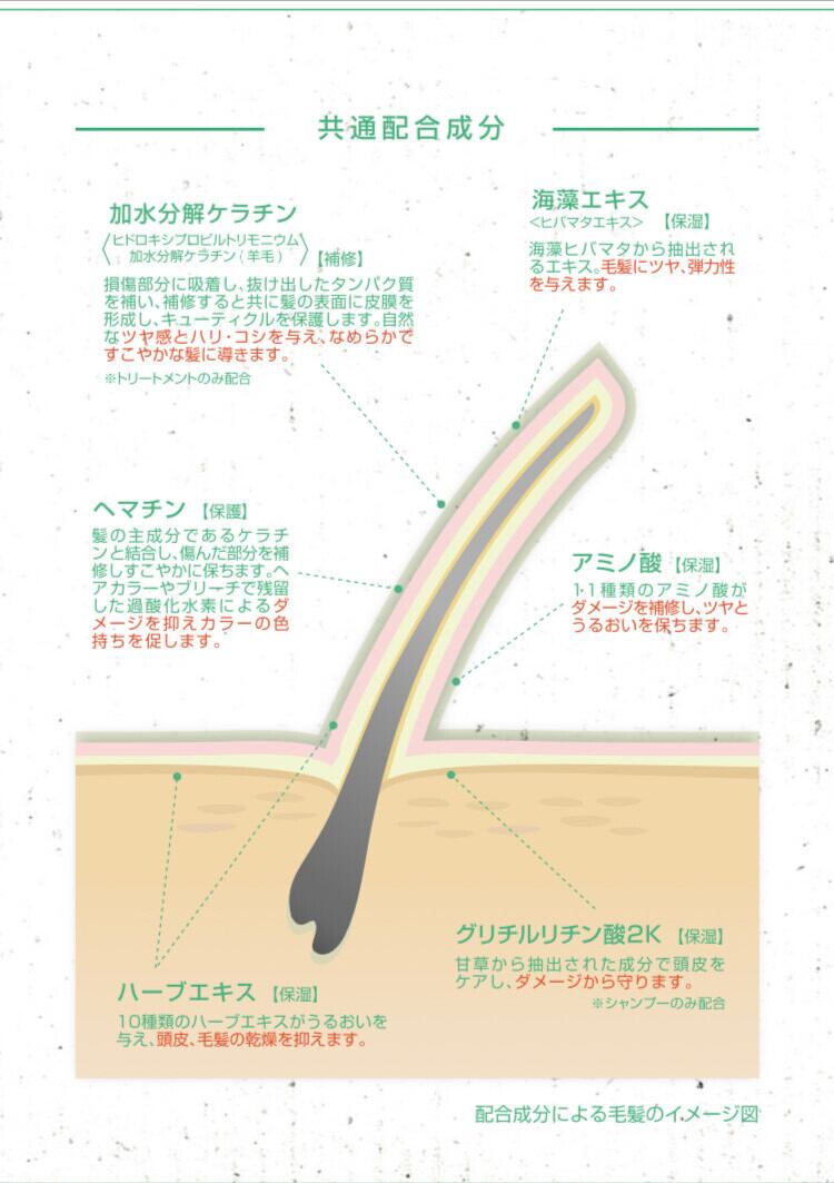 植物由来成分を配合し、保湿効果と潤いを与え、くせや広がりをしっかり抑えまとまりのある毛髪へと導きます。